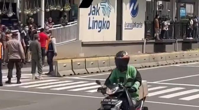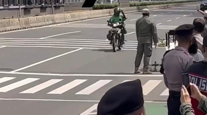 Momen Lucu Ojol Santai Lintasi Jalur Steril Parade MotoGP di Jakarta Sambil Lambaikan Tangan