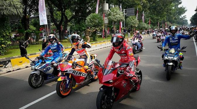 KANLELEGORENG-Sejumlah pembalap MotoGP melakukan parade hari ini, Rabu (16/3/2022) di Jakarta. Parade MotoGP tersebut dilakukan mulai dari Jalan Medan Merdeka Utara hingga menuju Bundaran Hotel (HI).